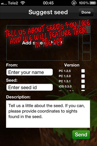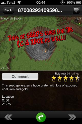 《我的世界种子 Minecraft Seeds Pro》是一款《我的世界 Minecraft》的游戏工具。用这款工具你可以轻松找到热门的种子(Seeds),去新的地图上挖掘快乐。MC的世界是随机生成的,生成的原理是基于Seed,在选择创建一个新的世界之后,会随机生成一段代码,之后所有世界内地形的生成都会基于这段代码,而这段代码就是种子(Seed)。人们可以通过分享自己的种子,把自己创造的世界分享出去。而这个工具则是让玩家轻松去获取世界各地优秀的种子