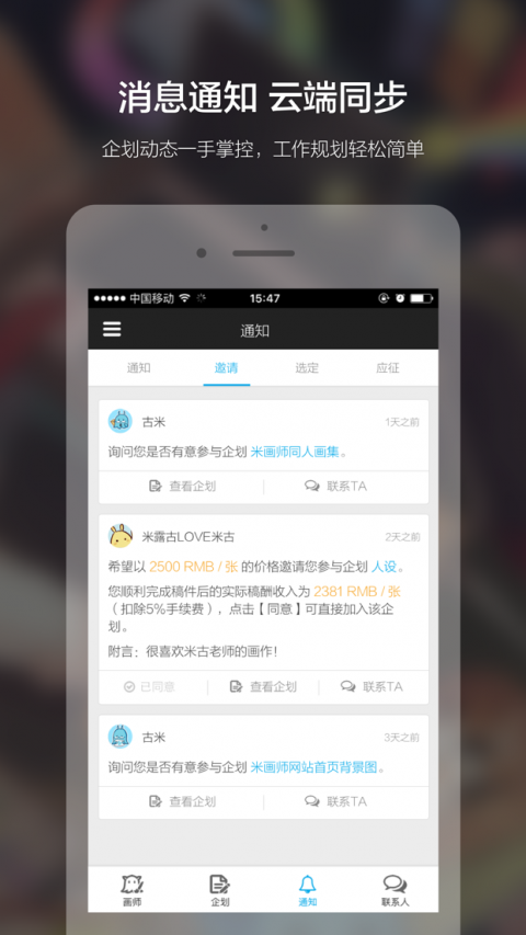 4、通知消息与网站同步,邀请、应征、选定、推送,现在你只要登陆APP就能迅速查收以上类别的最新通知。