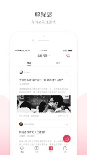 心圈子是为用户打造的在线交流小组,这里会入驻大批心理咨询师、心理学爱好者,进行专业知识的探讨、朋辈督导、答疑解惑。