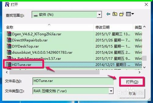 2、在R打开的窗口,找到我们需要修复的压缩文件并左键点击,再点击:打开;