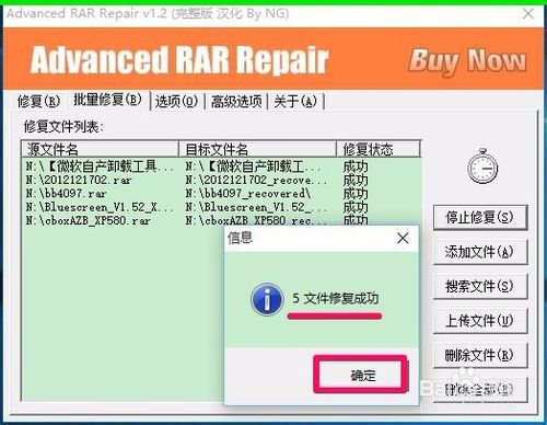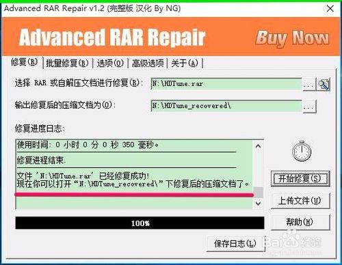 4、修复完成,弹出信息对话框:文件 N:\HDTune.rar 已经修复成功 ! 现在你可以打开“N:\HDTune_recovered\”下修复后的压缩文档了。我们点击:确定;