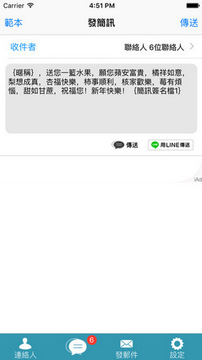 当由联络人详细资料点选邮件/邮件,再使用精美的邮件/简讯范本,自动为您贴心将范本昵称换成联络人昵称。美观又大量的范本,朋友生日该说什么祝福的话?不用烦恼这么多,只要选一个范本放上去就可以马上发送,平常送上点小关心小祝福,人脉王就是你。