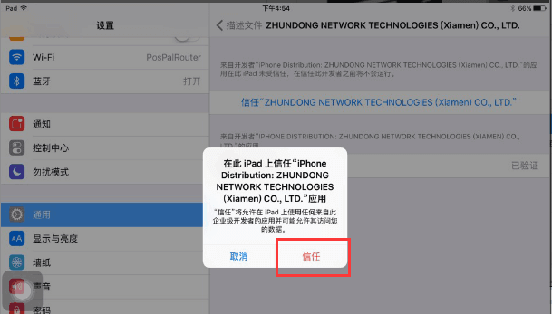 3、如下图点击信任应用程序配置文件‘ZHUNDONGNETWORKTECHNOLOGIES(xiamen)CO.,LTD.’