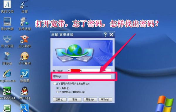 1,打开桌面的宽带连接,忘了密码,怎样找出自已保存在电脑内的宽带密码。