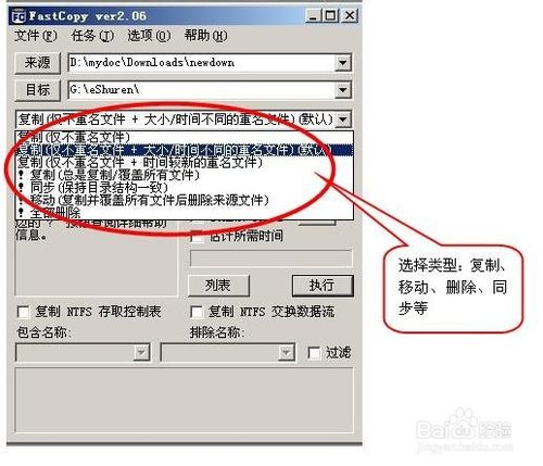 通过“目标目录”文本框下的下拉菜单按钮就可以挑选七种不同的操作方式。这里,复制项相对多些,都是在复制时经常会遇到的处理办法。