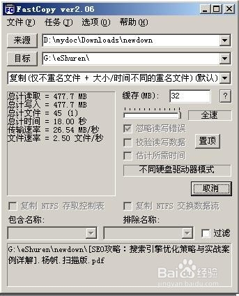 Fastcopy是日本的最快的文件拷贝工具。磁盘间相互拷贝文件是司空见惯的事情,通常情况都是利用WINDOWS自带的复制粘贴功能来实现的。这样做在数目较小的情况下倒也没什么问题,但是数目较大时,系统自带的复制功能就有些力不从心了。这时就需要FASTCOPY。一个424MB的电影其拷贝时间仅为21秒,传输速度达到了21MB/秒,不知比TotalCopy之流快了多少倍。【工作原理】