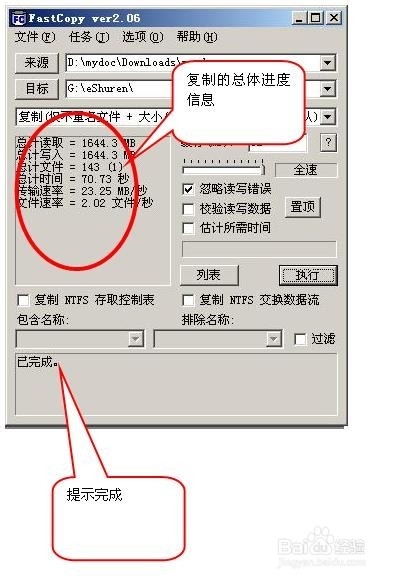 在执行过程中会显示读取、写入、时间、传输效率、文件速率等信息,在下方的文本框中会显示当前拷贝的内容。拷贝完成后点击“显示列表”按钮可以查看拷贝内容及错误文件、目录信息。