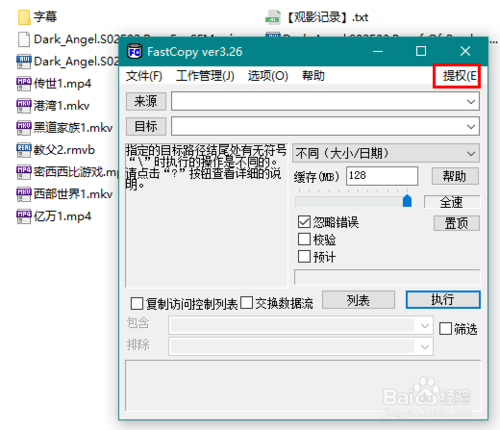 首先,启动 FastCopy,点击主界面右上角的“提权”。