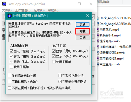 在此需要提醒大家的是,这里的“卸载”只是将 FastCopy 从鼠标右键菜单中移除,并不是卸载 FastCopy 程序。