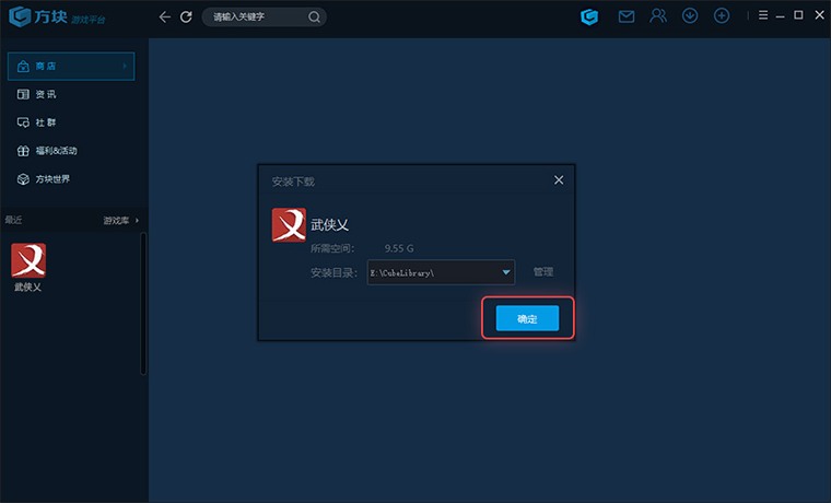 登录成功后提示安装《武侠乂》客户端,确认安装目录后点击“确定”开始安装