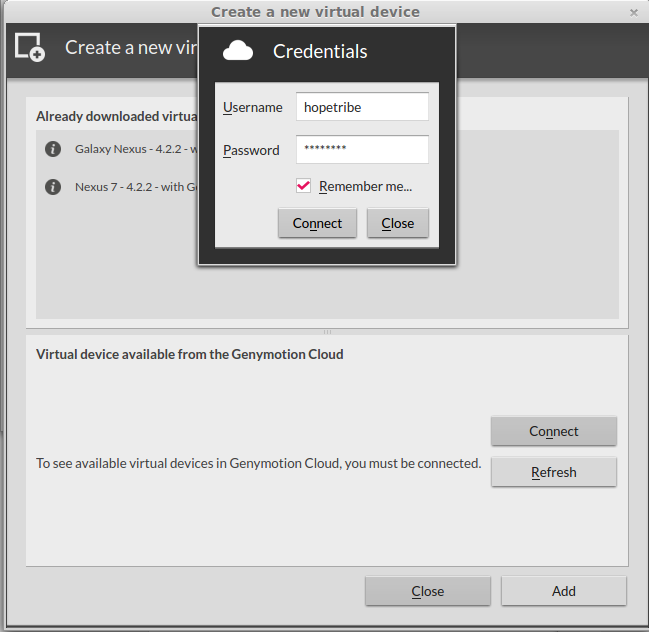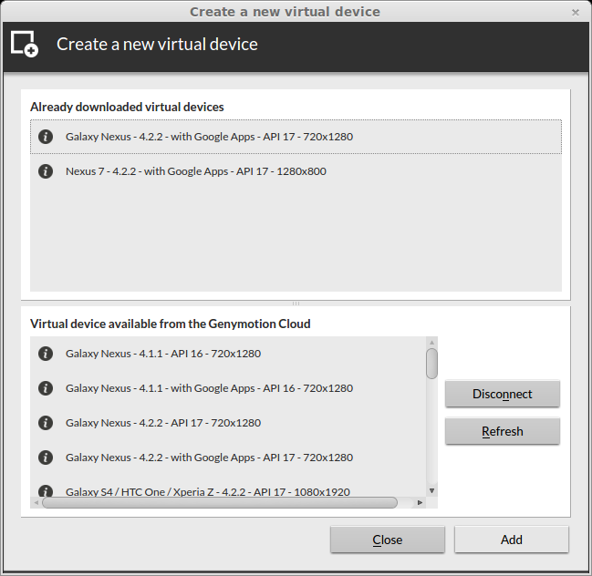 使用Genymotion创建虚拟设备在首页界面,点击ADD按钮。