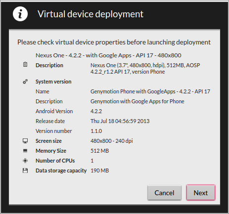 Genymotion支持Windows、Linux和Mac OS等操作系统,容易安装和使用:按简单的安装过程,选择一款Android虚拟设备,开启后就体验Genymotion带来的快感吧。