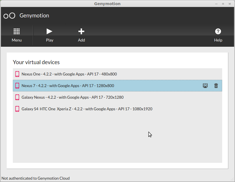 回到主窗口,选择一添加的模拟器,如“Nexus 7”,点击“Play”启动模拟器