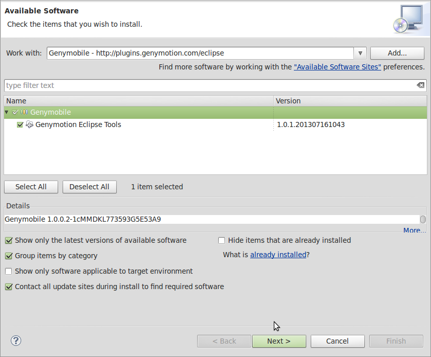 Genymotion还支持Eclipse IDE,这大大方便了我们使用Genymotion来开发应用。插件的安装有两种方式,介绍如下: