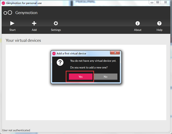 第一次进入Genymotion,会检查你是否有安卓虚拟设备。如果没有会弹出对话框,询问你是否现在添加一个虚拟设备,点击yes或者no就可以了。