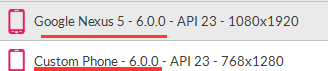 注意,每一个API版本可以对应多个机型,此处下载安装的是API版本。例如,下面两个虚拟设备,Google Nexus5 - 6.0.0和Custom Phone – 6.0.0,如果已经存在了其中一个设备,那么另外一个设备创建的时候不需要重复下载了,可直接创建成功。