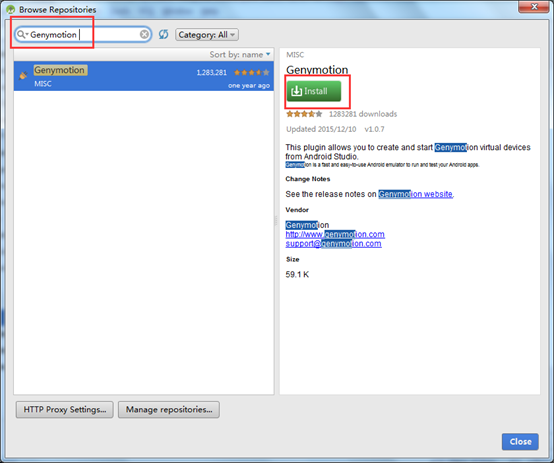 在搜索输入框中输Genymotion进行搜索查找,然后点击右侧的Install按钮。