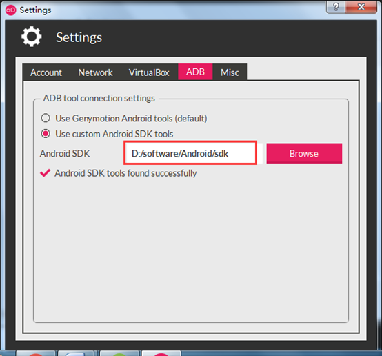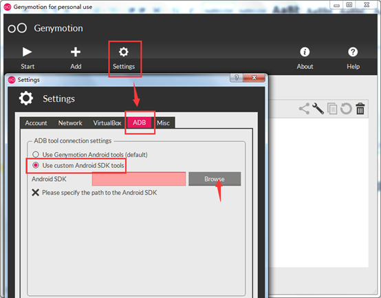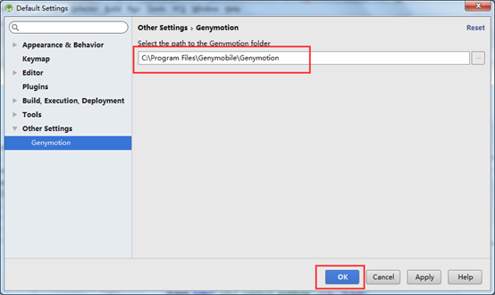 点击这个genymotion图标,打开关联模拟器设置(setting——other setting->genymotion)界面,关联模拟器: