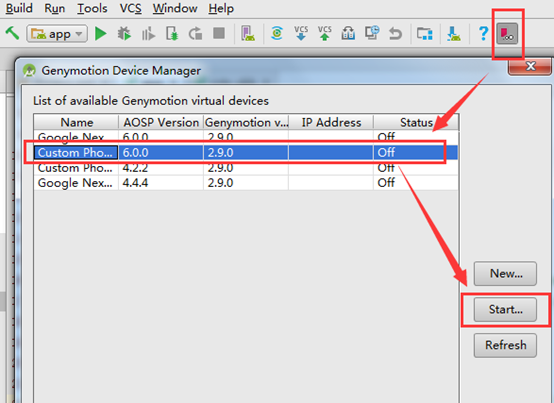 点击genymotion图标或者打开Genymotion软件,启动其中一个模拟器,那么run项目就会看到genymotion的虚拟设备。