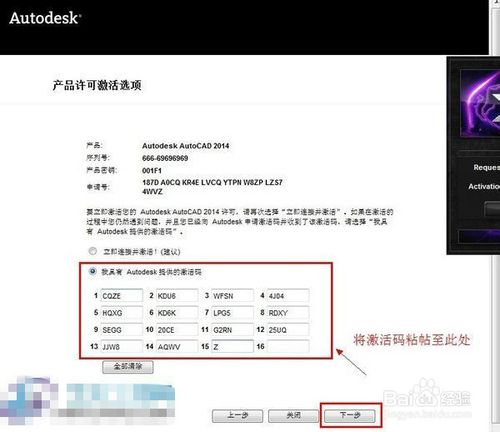 7、最后复制Activation中的激活码至“输入激活码”栏中,并点击下一步完成激活。这样就完成了Autodesk产品的注册了