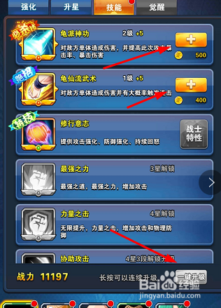 第四种提升战力方法就是升级技能,有利于提高暴击率,增加攻击,如图所示