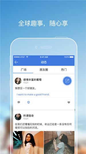3.动态:个人心情、朋友圈靓照一键轻松分享全球,即时捕捉全球趣事,点赞评论、随时随地和老外精彩互动。完善个人资料,收获更多来自世界各地志同道合的外国友人,将社交朋友圈开拓到国际!