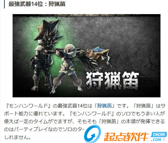 第十四名:狩猎笛狩猎笛在辅助能力方面很优秀。虽然在单刷方面如果玩家很擅长此武器的话也能达到一定的速通成绩,但就狩猎笛本身而言,发挥他本领的舞台在组队联机上,因此不必太在意单刷时的任务时间会比较好。