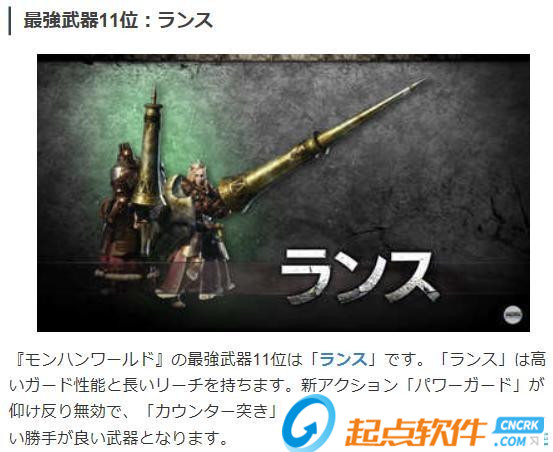 长枪拥有高防御性能和长攻击距离,新招式「力量防御」可使得防御硬直无效,在结合「突刺反击」,是一种非常有效且易于使用的武器。