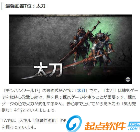 「太刀」一边维持练气槽一边攻击,在看到空当的时候使用练气槽很重要。依据练气槽的颜色而攻击力也会随之出现变化,如能把练气槽提升到红色就使出高威力的“爆破空气斩”来进行攻击吧。