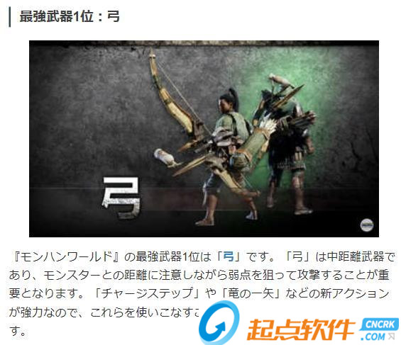 「弓」是中距离武器,在保持和怪物的距离的同时不断瞄准弱点射击是非常重要的。“蓄力滑步”和“龙箭”等新招式非常强力,掌握这些招式被看做是成为一个好弓手的第一步。。。