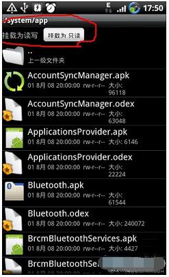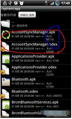 5、在这里面就是系统程序了,每个程序有两个文件,apk、odex,可以都删也可以保留apk放到sd卡里以后要了装,看自己的选择: