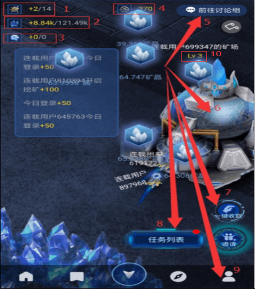 数字2所示:8。84k为今天挖到矿晶,121。49k为总共矿晶数,k为千