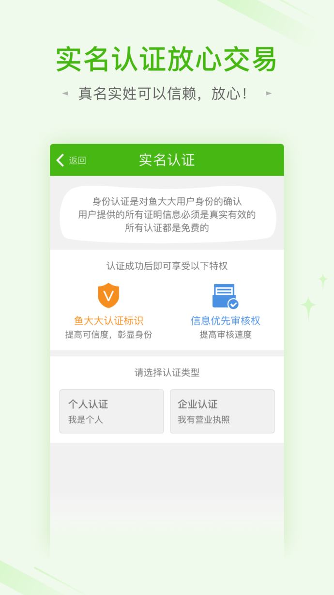 实名认证,担心信息泄露?鱼大大有一套健全私密信息安全保护措施,向每一个用户承诺:您的身份信息,我们绝对严格保密,无需担忧。
