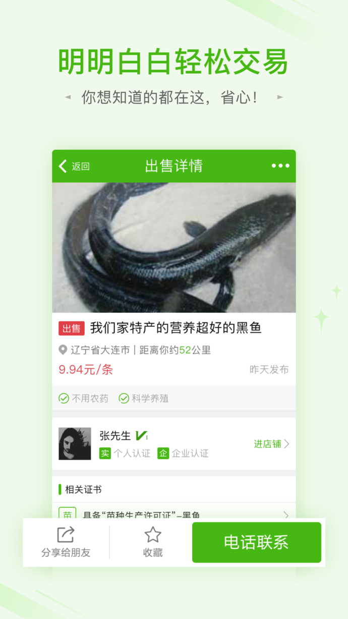 6.实名认证的买卖信息,让你的水产品交易更加安全,不用担心碰到骗子;实名认证后可以提高成交率,时间长了可以积累信用,让以后生意更好做哦