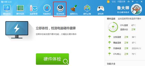 3、打开“鲁大师”进行“驱动检测”,然后升级显卡驱动即可。