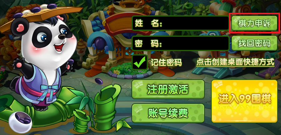 第一步:在99围棋登录界面点击“棋力申诉”按钮。