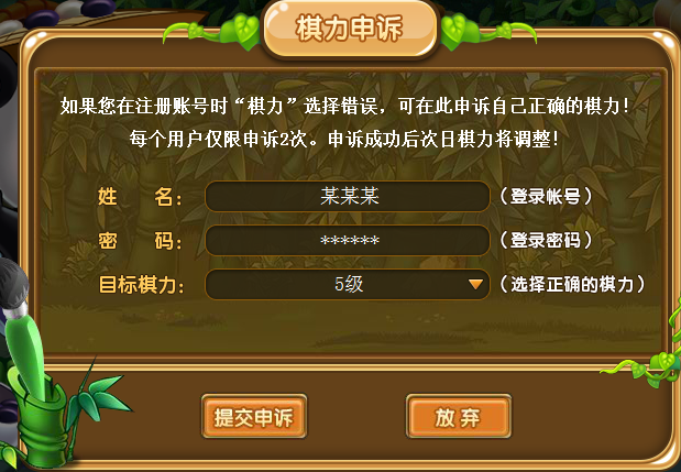 第二步:在弹出的“棋力申诉”框中填入姓名、密码,下拉选择正确的棋力,点击“提交申诉”;申诉成功后,次日棋力将调整为申诉的棋力。