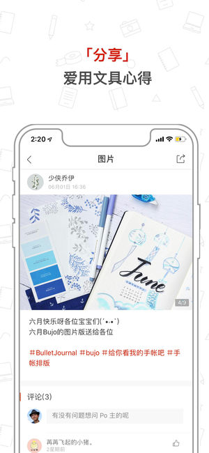 1.「分享」你爱用的文具产品和文具使用心得2.「浏览」精挑细选的文具干货文章、精美图片