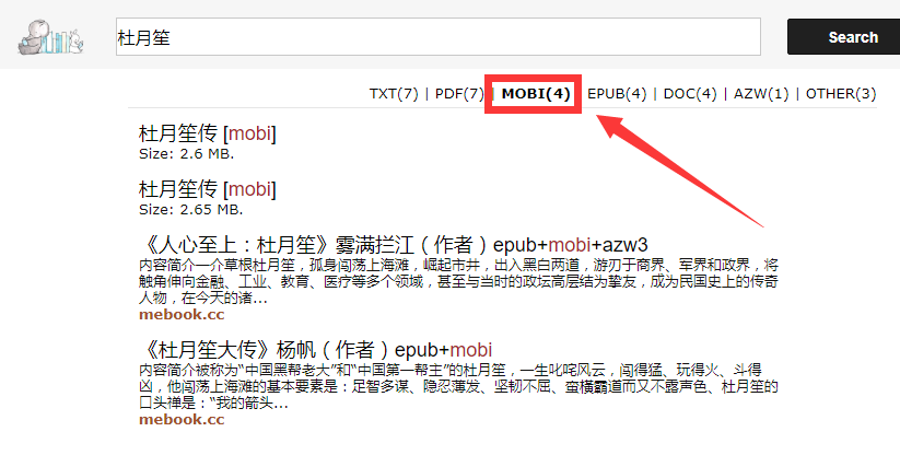 接下来我们点击【mobi】,快速筛选 杜月笙 mobi资源: