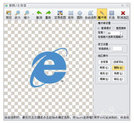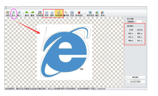 以上介绍的使用魔法棒抠图,一般是纹路比较清晰的图片。但是对于很多图片,我们可能选取不能一次处理好,可以通过放大图片,和自由选取,多边形选取来配合使用抠图