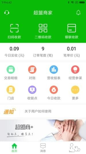 1、快速开通深受用户欢迎的支付方式只需2分钟简单注册超盟商家app,即可帮您接入主流移动支付方式。超盟商家app支持T+1到账,支持卡台收款、APP主扫收款。不定期参加微信支付宝官方活动。