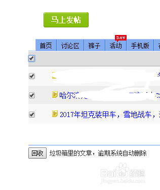 在每个帖子前面有个小正方格,点击就会打钩,【回收】的话又会恢复,所以不去动它,文章,逾期系统会删除。