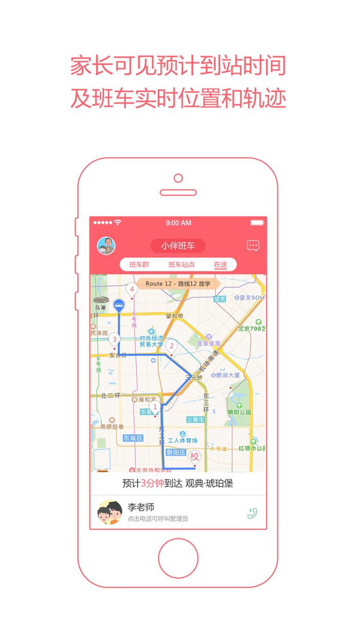 极简设置与操作: 通过校车跟车老师的手机精准定位,无需加装额外硬件。提供校车站点信息后,下载小伴手机APP,3分钟完成注册,即可使用。