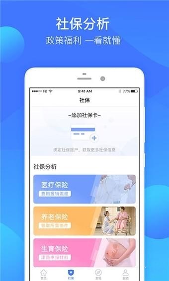5.社保政策解析:提供社保、公积金政策解读,详解医保、养老险、工伤险、生育险、失业险中的社保福利,实现社保用户买车、买房、子女上学的刚性需求。