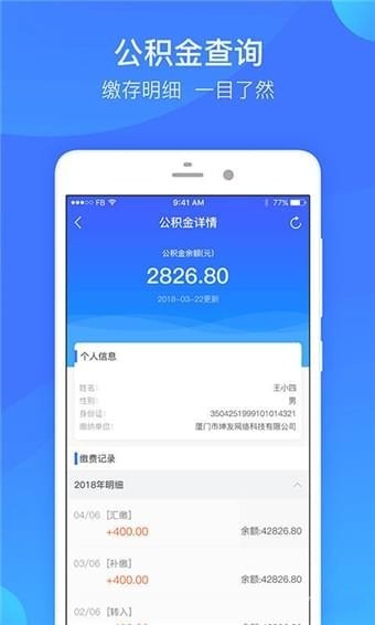 2.公积金查询:随时随地对住房公积金查询,轻松掌握每月公积金账单明细,也可为家人公积金查询。