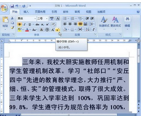 方法三:选中需要改变字体大小的文本块,在“开始”功能区的“字体”分组中单击“增大字体”或“减小字体”按钮改变文字大小。
