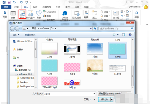 3、因为我是要插入图片,所以这里点击“图片”按钮,点击后,会打开“插入图片”对话框,选择我们要作为背景的图片,然后点右下方的“插入”按钮,这样我们就把图片添加到文档中了,但是这个时候的图片并不是背景图片