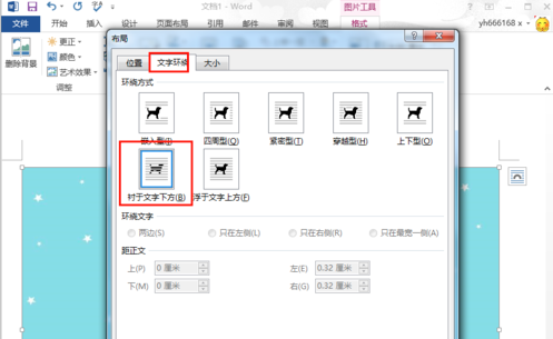 6、在“布局”对话框中,点击“文字环绕”选项,选择“衬于文字下方”,这个就是把图片设置为背景图片的,这样就可以在图片上面输入文字