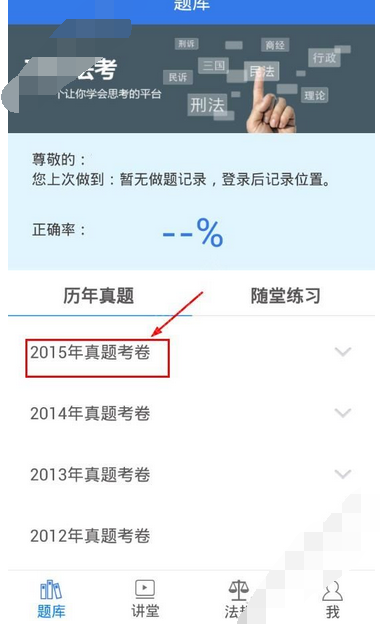 1、打开瑞达法考APP,在题库页面中选择历年真题下面的2015真题考卷;