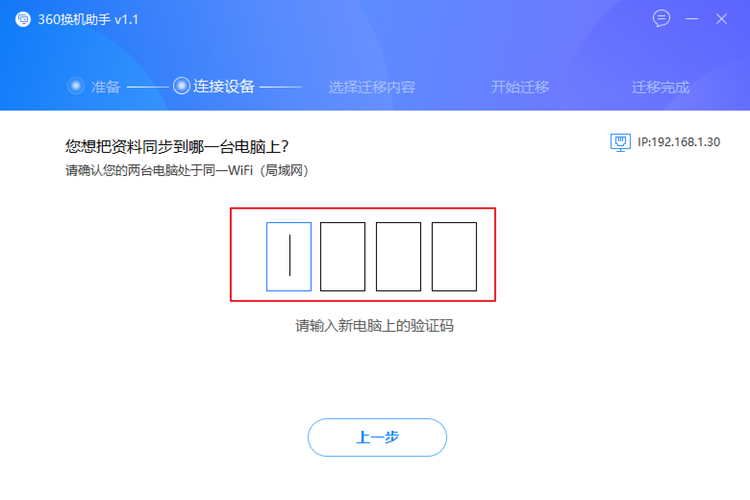 5、到这里程序会给您一个连接【验证码】,4个数字。记住这个验证码,我们现在回到【旧电脑】上完成后面的操作